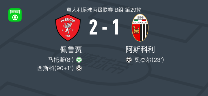 北京时间3月4日,意大利足球丙级联赛B组第29轮,佩鲁贾主场迎战阿斯科利。比赛中,佩鲁贾凭借马托斯的点球率先打破僵局。随后,阿斯科利由奥杰尔扳平比分。进入下半场补时阶段,西斯科为佩鲁贾打入制胜一球。最终,佩鲁贾以2-1战胜阿斯科利。