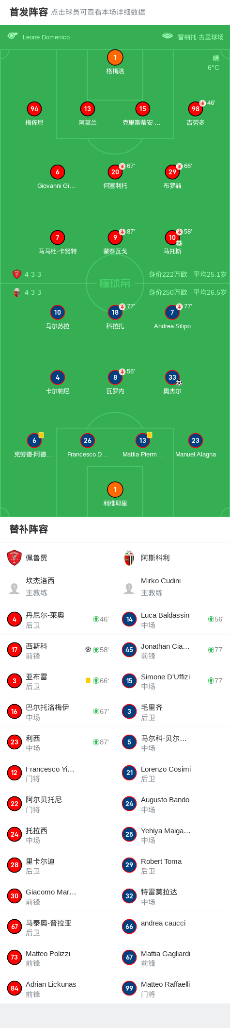 佩鲁贾2-1阿斯科利,西斯科破门,马托斯点射