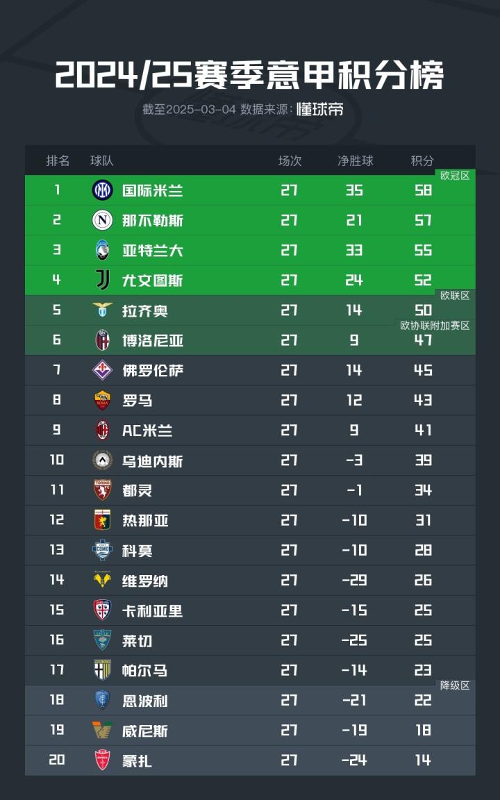 北京时间3月4日凌晨,2024/25赛季意甲联赛结束了第27轮的全部较量,积分榜的形势也出现了进一步的变化。