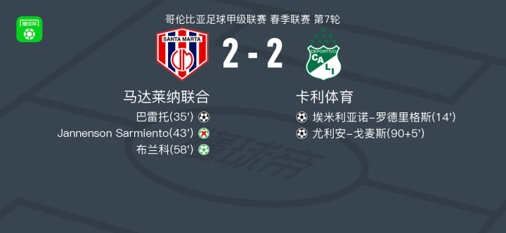 北京时间3月4日,哥伦比亚足球甲级联赛春季联赛第7轮,马达莱纳联合主场迎战卡利体育。比赛中,卡利体育的埃米利亚诺-罗德里格斯率先为球队打破僵局。随后,马达莱纳联合的巴雷托迅速扳平比分。不久后,马达莱纳联合获得点球机会,但Jannenson Sarmiento未能将球罚进。然而,布兰科随后成功罚入点球,帮助球队反超比分。比赛尾声阶段,卡利体育的尤利安-戈麦斯接埃米利亚诺-罗德里格斯的助攻再度扳平比分。最终,双方以2-2握手言和。