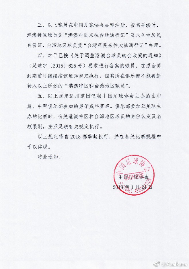 根据中国足协此前曾发布的“港澳台球员规定”,“港澳特区和台湾地区球员”特指,首次注册足协为香港或澳门足球总会的球员,且该球员系港澳特区永久性居民中的中国公民;首次注册足协为中国台北足协的球员,且该球员户籍为台湾地区。上述球员的身份由其首次注册足协(总)认定,并提供确认文件及相关材料。