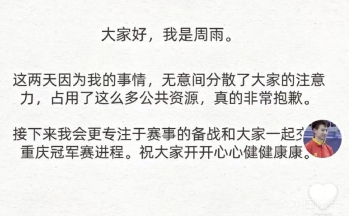 北京时间3月4日,针对近期的离婚传言,前国乒球员周雨更新社媒,向大家解释并道歉。
