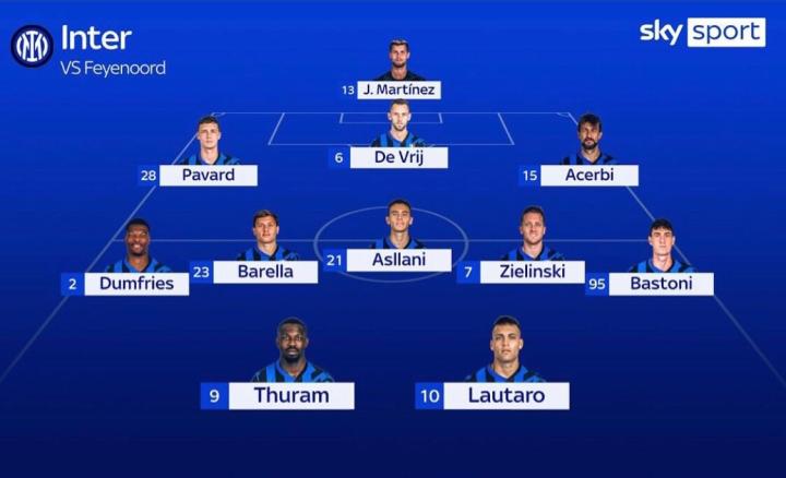 何塞普-马丁内斯;帕瓦尔、德弗赖、阿切尔比;邓弗里斯、巴雷拉、阿斯拉尼、泽林斯基、巴斯托尼;马库斯-图拉姆、劳塔罗