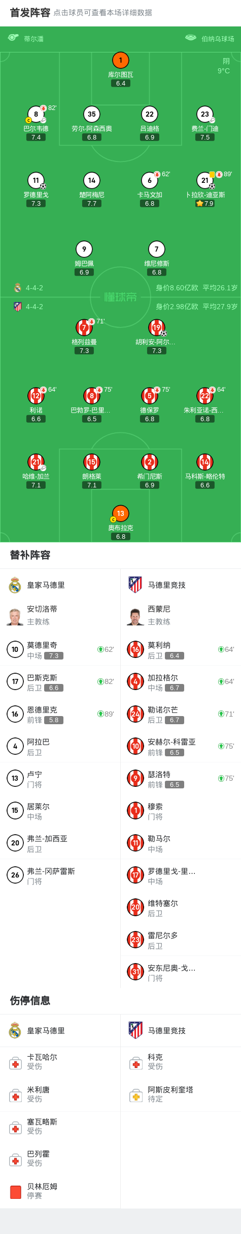 北京时间3月5日04:00,欧冠1/8决赛首回合,皇家马德里坐镇主场伯纳乌球场迎战马德里竞技,本场主裁判为蒂尔潘。上半场,罗德里戈内切兜射破门,朱利亚诺-西蒙尼禁区内抽射打偏,维尼修斯远射被门将没收,阿尔瓦雷斯世界波破门扳平比分。下半场,姆巴佩远射被门将没收,卜拉欣-迪亚斯低射破门,希门尼斯抽射打高,最终,皇马2-1战胜马竞。