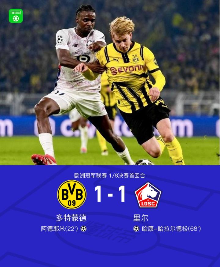 北京时间3月5日,欧洲冠军联赛1/8决赛首回合,多特蒙德迎战里尔。上半场,阿德耶米禁区外抽射破门,将场上比分改写。格罗斯越位在先,进球被吹无效。下半场,乔纳森-戴维助攻,哈拉尔德松破门将比分扳平。最终,多特主场1-1战平里尔。