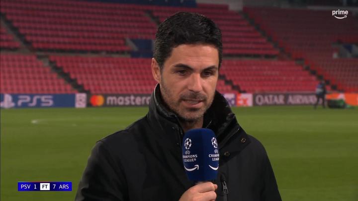 率队在欧冠1/8决赛首回合客场7-1狂胜PSV埃因霍温之后,阿森纳主教练阿尔特塔接受了来自亚马逊Prime Video的采访。