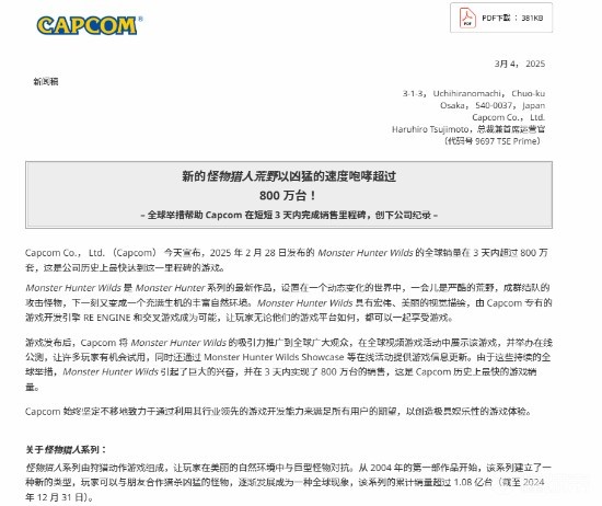 《怪物猎人:荒野》开售三天销量破800万份,创最快销售纪录尼古拉约基奇 @懂球帝2025-03-05 09:21北京时间3月4日,卡普空于官网发布文章,宣布《怪物猎人:荒野》在发售的三天内,全球销量已超过800万,达成卡普空游戏最快卖出800万份的里程碑。卡普空官方提到,《怪物猎人:荒野》具有宏伟美丽的视觉描绘,卡普空专用的RE引擎让跨平台游戏成为可能。截至2024年12月31日,《怪物猎人》系列累计销量超过1.08亿份。展开更多