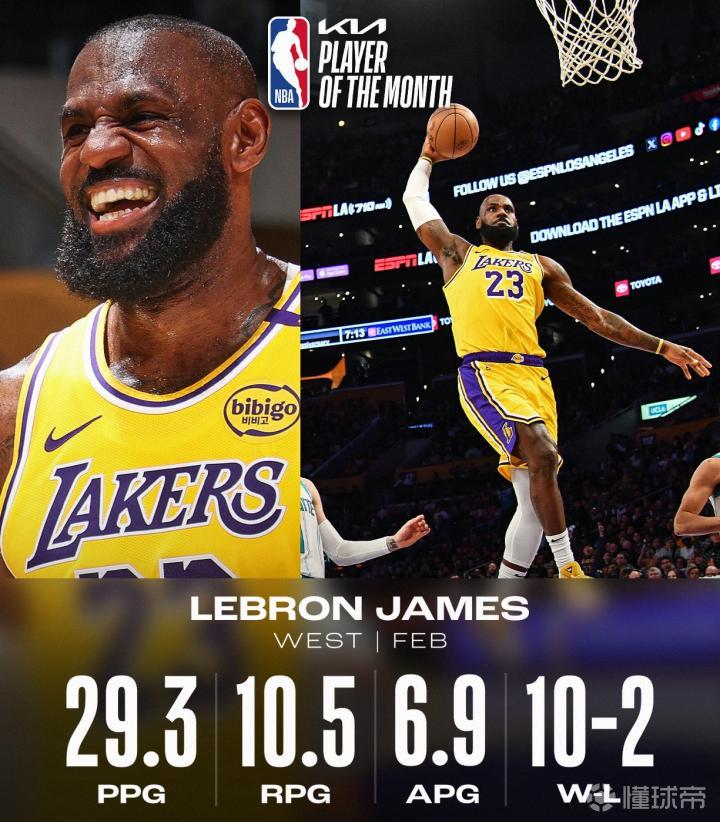 詹姆斯在2月份的场均数据为29.3分10.5篮板6.9助攻,帮助湖人取得10胜2负的战绩,他因此当选NBA2月西部最佳球员。