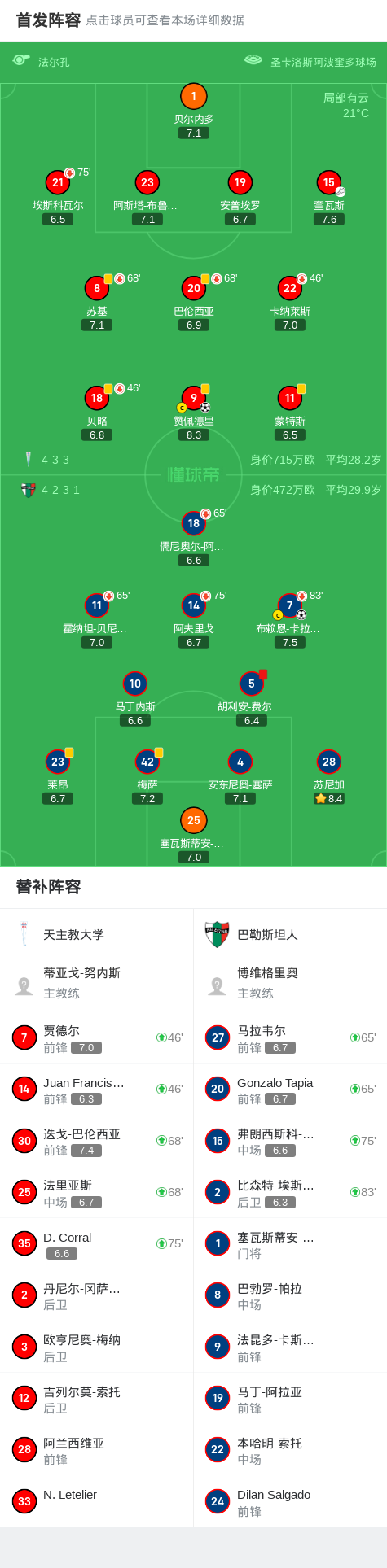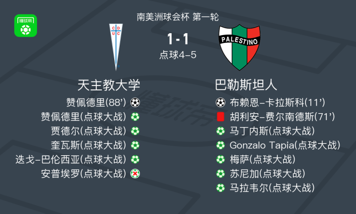 北京时间3月5日,南美洲球会杯第一轮,天主教大学迎战巴勒斯坦人。比赛中,巴勒斯坦人率先打破僵局,布赖恩-卡拉斯科为球队取得领先。随后,胡利安-费尔南德斯因犯规被红牌罚下,使得场上局势发生变化。天主教大学在比赛尾声由奎瓦斯助攻赞佩德里扳平比分。 进入点球大战后,双方球员轮流主罚。巴勒斯坦人方面,马丁内斯、Gonzalo Tapia、梅萨、苏尼加和马拉韦尔先后命中点球;天主教大学则由赞佩德里、贾德尔、奎瓦斯和迭戈-巴伦西亚成功罚入点球,但安普埃罗的点球未能命中。最终,巴勒斯坦人以6比5战胜天主教大学,晋级下一轮。