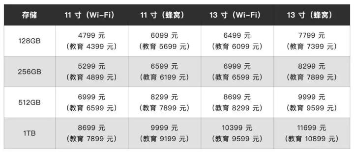 Wi-Fi版128GB:2999 元;256GB:3499 元;512GB:5199 元。