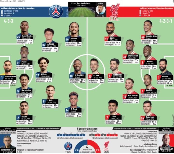 北京时间3月6日凌晨4时,巴黎圣日耳曼将会在欧冠1/8决赛首回合的比赛中坐镇主场迎战利物浦,赛前《队报》预测了两队本场比赛的首发名单。