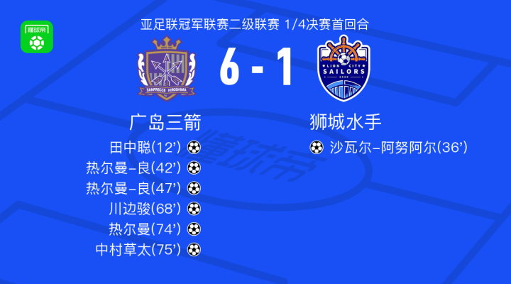 在北京时间3月5日进行的亚足联冠军联赛二级联赛1/4决赛首回合中,广岛三箭与狮城水手展开激烈较量。比赛中,广岛三箭凭借田中聪的精彩破门率先打破僵局。随后,热尔曼-良表现出色,梅开二度为球队扩大优势。川边骏和热尔曼也相继建功,进一步巩固了领先位置。中村草太同样贡献了一粒进球。狮城水手方面,沙瓦尔-阿努阿尔为球队扳回一城。最终,广岛三箭以6-1大胜狮城水手。