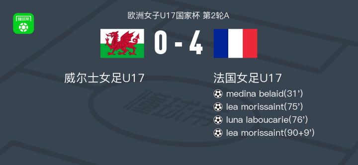 北京时间3月5日,欧洲女子U17国家杯第二轮A组的一场比赛中,威尔士女足U17迎战法国女足U17。比赛中,法国队展现出色的团队配合和进攻实力。medina belaid率先打破僵局,随后lea morissaint梅开二度,luna laboucarie也有一球进账。最终,法国女足U17以4比0战胜威尔士女足U17,取得了一场大胜。
