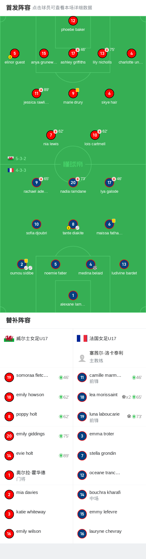 法国女足U17 4-0大胜威尔士女足U17,lea morissaint两球,luna laboucarie破门