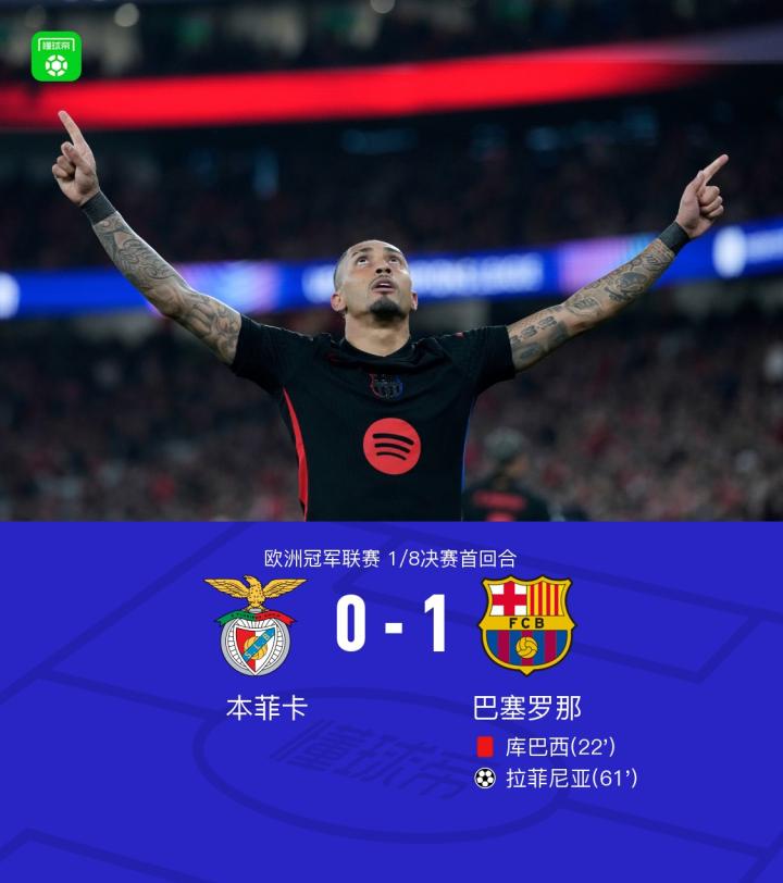 北京时间3月6日,欧洲冠军联赛1/8决赛首回合,本菲卡对阵巴塞罗那。比赛中,巴塞罗那球员库巴西因犯规被红牌罚下,导致球队在大部分时间里少一人作战。尽管如此,拉菲尼亚在比赛中成功打入一球,帮助巴塞罗那取得领先。最终,本菲卡未能扳平比分,比赛以0-1告终,巴塞罗那赢得胜利。
