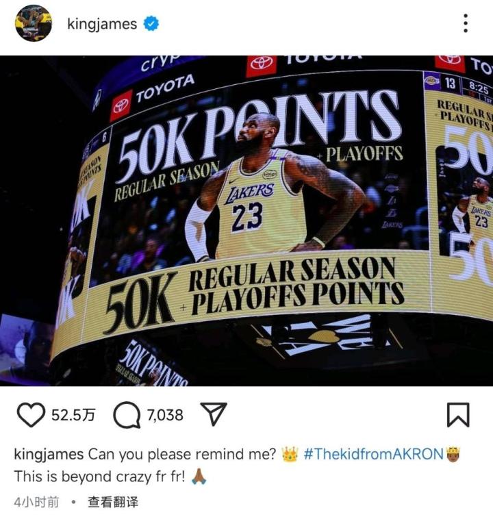詹姆斯社媒庆祝5万分里程碑,配文:你能提醒我一下吗?太疯狂了南京伦敦体育场小杨 @懂球帝2025-03-06 09:26北京时间3月6日,湖人球星詹姆斯更新社媒,庆祝自己达成生涯50000分里程碑。詹姆斯晒出了昨日比赛大屏上的照片,并配文:“你能提醒我一下吗?👑 来自阿克伦的孩子🤴🏾 这真的太疯狂了!🙏🏾” 此外,詹姆斯还晒出了一段视频,并写道:“如果我不行,那你来!👑” 展开更多