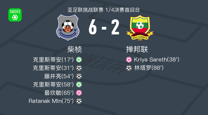 柴桢6-2大胜掸联,克里斯蒂安帽子戏法,Ratanak Min破门