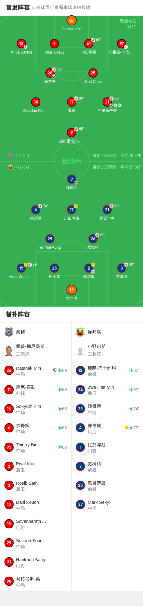 第75分钟,柴桢球员尼克-泰勒助攻Ratanak Min打入一球。