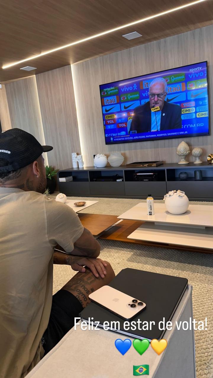 内马尔在社交媒体晒出他在电视机前观看巴西队主帅多里瓦尔公布大名单直播的照片,并配文:“很高兴回来!💙💚💛🇧🇷”