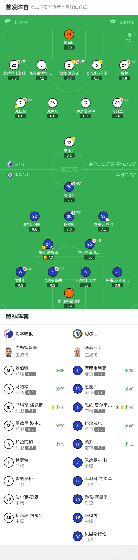 切尔西客场2-1哥本哈根,里斯-詹姆斯、恩佐破门,古斯托伤退