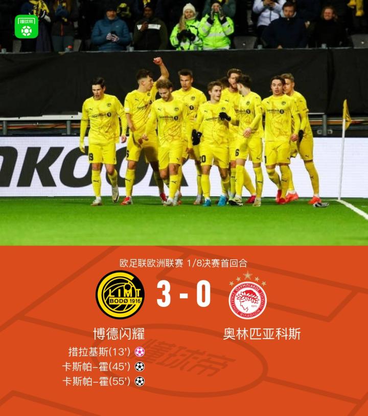 在北京时间3月7日进行的欧足联欧洲联赛1/8决赛首回合中,博德闪耀与奥林匹亚科斯展开激烈对决。比赛中,奥林匹亚科斯球员措拉基斯不慎自摆乌龙,为对方送上一分。随后,博德闪耀的卡斯帕-霍表现出色,凭借队友的两次助攻,成功梅开二度。最终,博德闪耀以3-0战胜奥林匹亚科斯,取得了一场关键胜利。