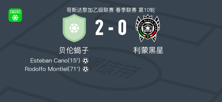贝伦蝎子2-0利蒙黑星取哥斯乙3连胜,Esteban Cano建功,Rodolfo Montiel锁定胜局
