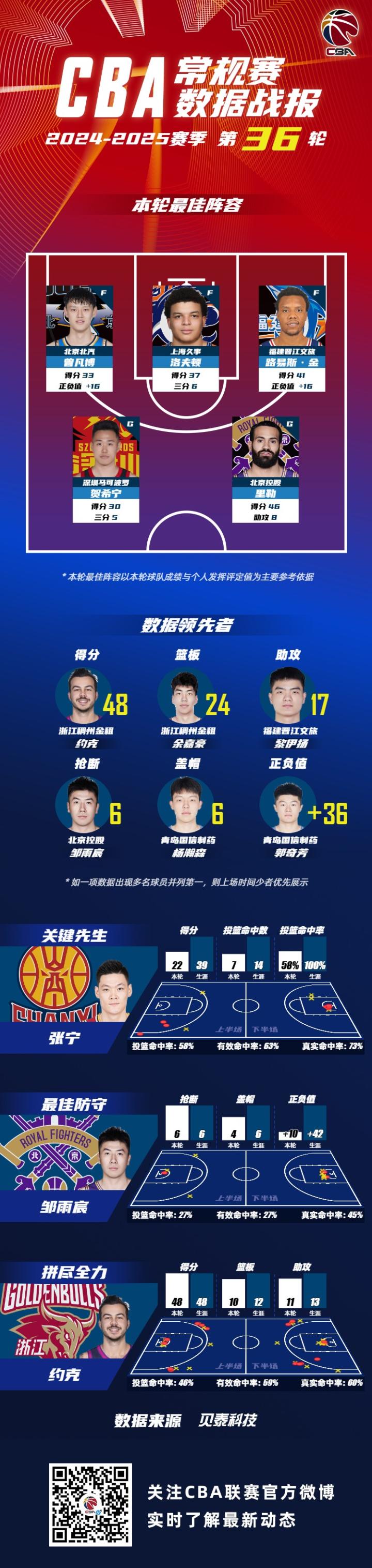 数据领先者方面,浙江稠州男篮球员约克以单场48分的数据领衔得分榜;