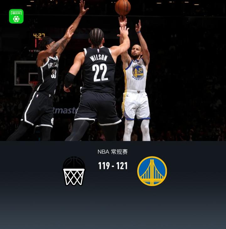 第四节,开节勇士巴特勒领先持续强硬攻框再度反超,篮网没能及时回应,随后库里里突外投连续得分将分差拉大至两位数,篮网展开反扑一度追分至5分分差,随后勇士库里三分再度拉至10分,比赛还剩1分钟,篮网卡梅隆-约翰逊迅速连拿5分,随后勇士依旧进攻不中,篮网托马斯三分再中追至2分,勇士库里两罚全中,好在篮网托马斯抢投不中压哨两分无济于事,全场结束,勇士121-119险胜篮网。