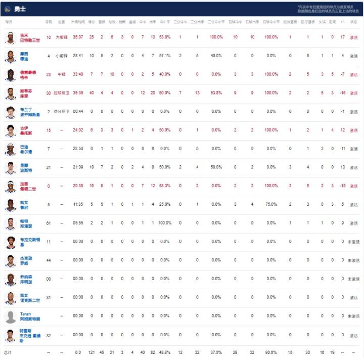 布鲁克林篮网卡梅隆-约翰逊24分5板4助,托马斯23分3板7助;金州勇士斯蒂芬-库里40分4板4助,吉米-巴特勒25分2板6助。