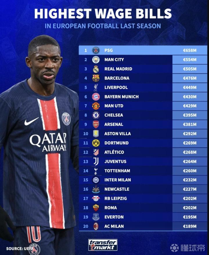 德转列欧洲球队薪资榜单:巴黎6.58亿欧居首,曼城、皇马前三