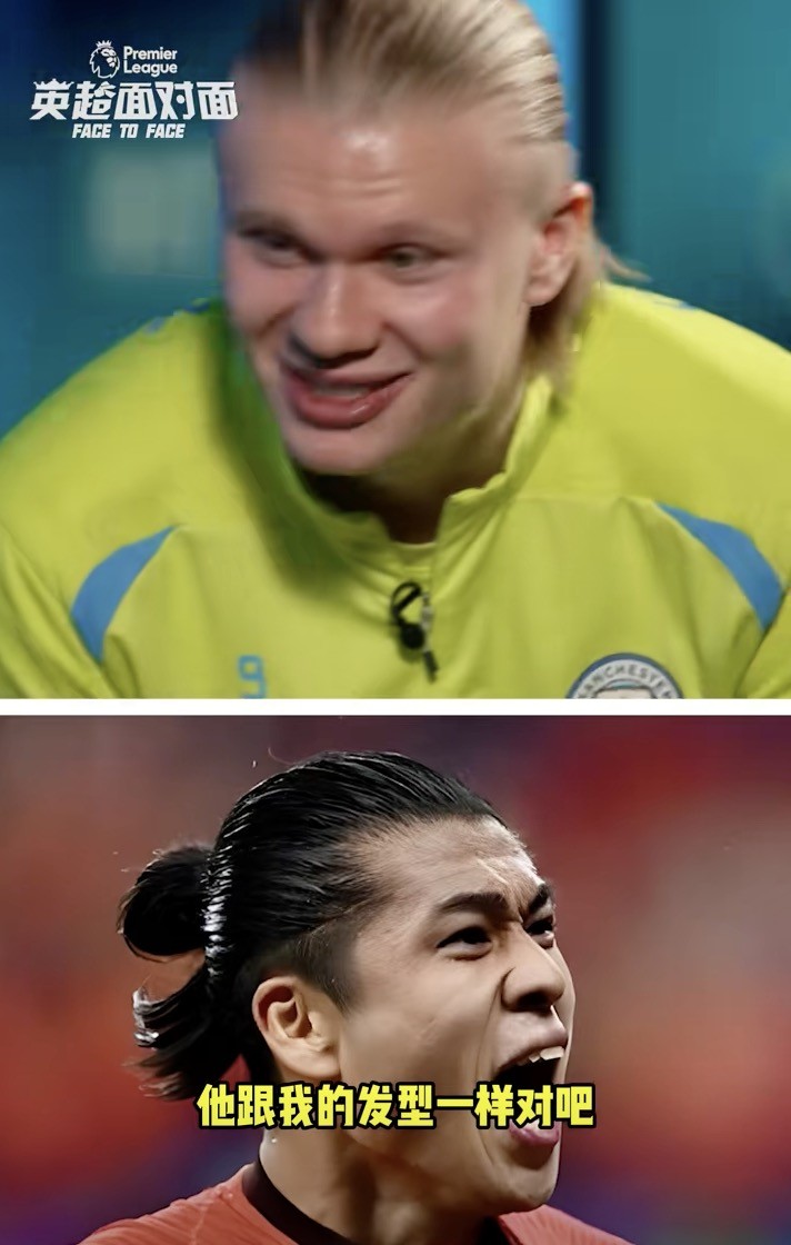在节目中,主持人先是介绍了张玉宁被称为“中国哈兰德”,并展示了一张照片,哈兰德表示:他的发型跟我的一样。主持人则补充说:他也是一名9号球员。