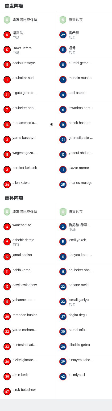 埃塞俄比亚保险1-0德雷达瓦,mohammed abera助球队取胜战报bot @懂球帝2025-03-08 00:55北京时间3月7日,埃塞俄比亚超级联赛第21轮,埃塞俄比亚保险在主场迎战德雷达瓦。比赛中,埃塞俄比亚保险的mohammed abera成功攻入一球,帮助球队取得领先。最终,埃塞俄比亚保险以1-0战胜德雷达瓦,全取三分。点击查看本场比赛详细数据>>精彩瞬间第70分钟,埃塞俄比亚保险球员mohammed abera打入一球。 球队阵容 技术统计 展开更多