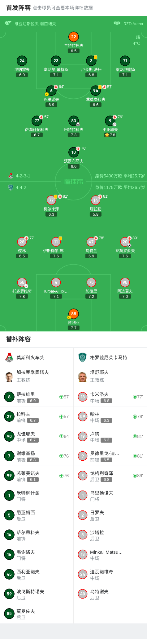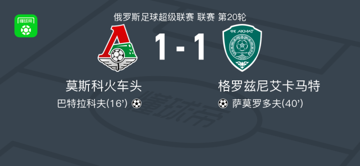 北京时间3月8日,俄罗斯足球超级联赛第20轮,莫斯科火车头主场迎战格罗兹尼艾卡马特。比赛中,莫斯科火车头的巴特拉科夫成功破门,为球队取得领先。随后,格罗兹尼艾卡马特的萨莫罗多夫也攻入一球,将比分扳平。最终,双方以1-1握手言和。