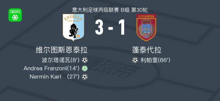 维尔图斯恩泰拉3-1蓬泰代拉取意丙3连胜,Andrea Franzoni点射,Nermin Karić破门