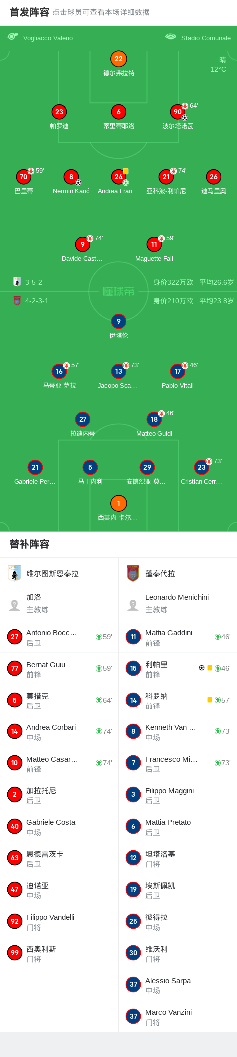 北京时间3月8日,意大利足球丙级联赛B组第30轮,维尔图斯恩泰拉主场迎战蓬泰代拉。比赛中,维尔图斯恩泰拉表现出色,波尔塔诺瓦、Nermin Karić 和 Andrea Franzoni 分别为球队建功。其中,Andrea Franzoni 是通过点球破门得分。尽管蓬泰代拉的利帕里也在比赛中攻入一球,但未能改变局势。最终,维尔图斯恩泰拉以3-1战胜蓬泰代拉,全取三分。