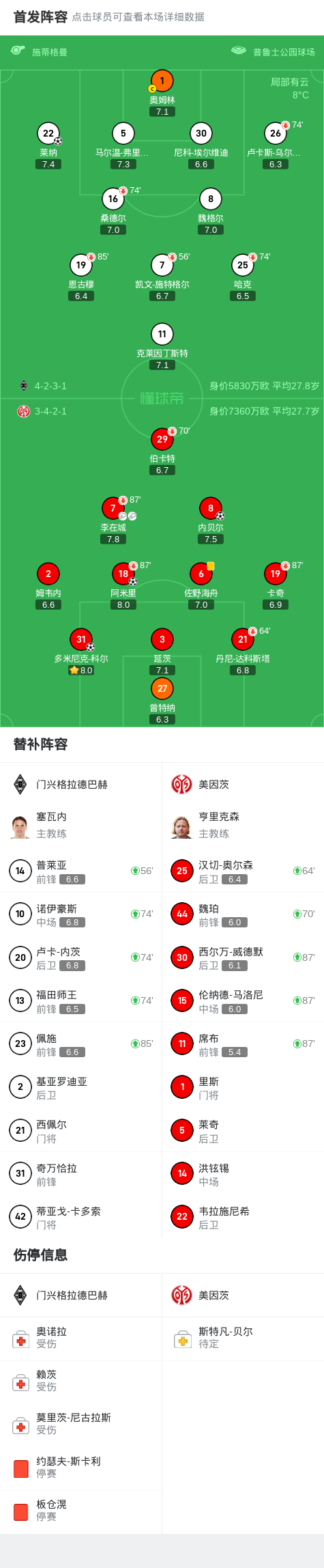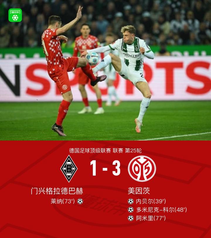 在北京时间3月8日进行的德国足球甲级联赛第25轮比赛中,门兴格拉德巴赫主场迎战美因茨。比赛过程中,美因茨表现出色,内贝尔和多米尼克-科尔相继为球队建功。随后,莱纳为门兴格拉德巴赫扳回一城,但阿米里很快再度为美因茨扩大领先优势。最终,门兴格拉德巴赫以1-3不敌美因茨。