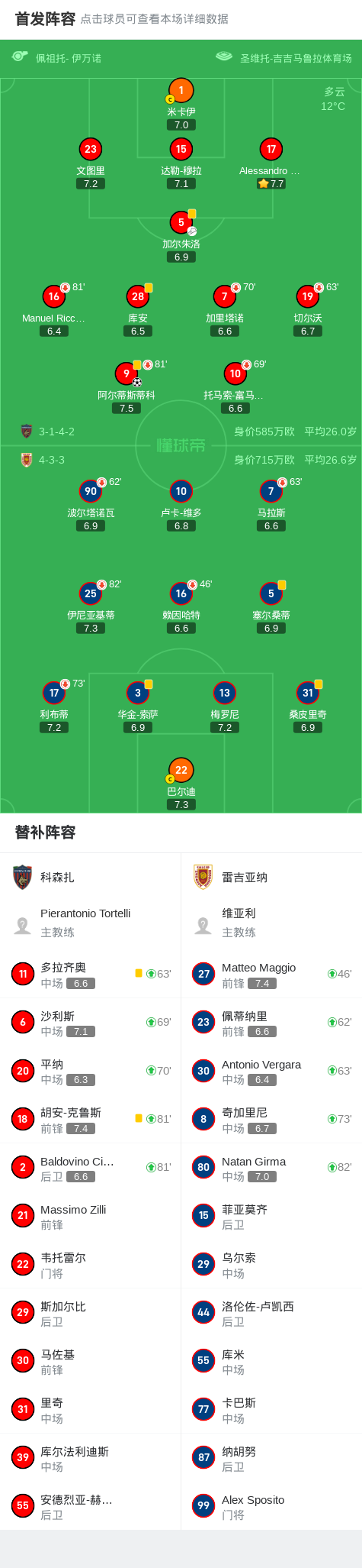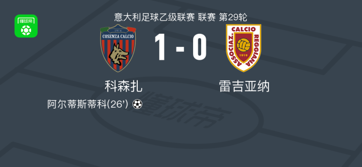 北京时间3月8日,意大利足球乙级联赛第29轮,科森扎主场迎战雷吉亚纳。比赛中,科森扎凭借阿尔蒂斯蒂科的进球取得领先。最终,科森扎以1-0战胜雷吉亚纳,全取三分。