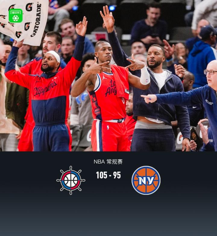 第四节快船博格丹拿下8分,尼克斯米卡尔-布里奇斯拿下6分,最终快船105-95战胜尼克斯