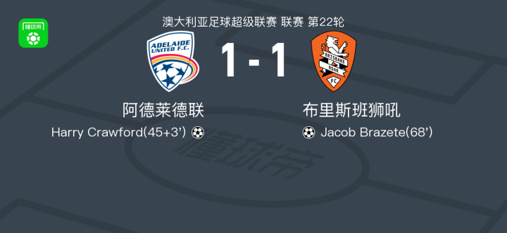 北京时间3月8日,澳大利亚足球超级联赛第22轮,阿德莱德联坐镇主场迎战布里斯班狮吼。比赛中,阿德莱德联凭借Harry Crawford的进球取得领先。随后,布里斯班狮吼由Jacob Brazete扳平比分。最终,双方以1-1握手言和。