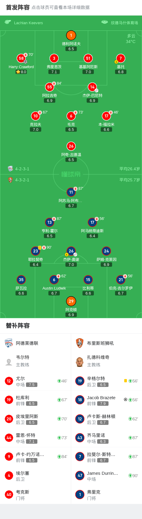阿德莱德联1-1布里斯班狮吼,Harry Crawford破僵,Jacob Brazete救主