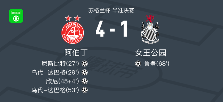 阿伯丁4-1大胜女王公园,乌代-达巴格梅开二度,欣尼破门