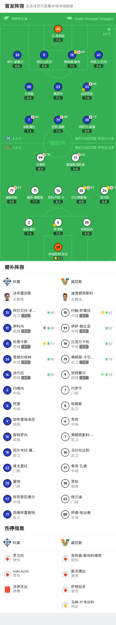科莫1-1威尼斯,伊科内破门,吉特夏尔补时点射绝平