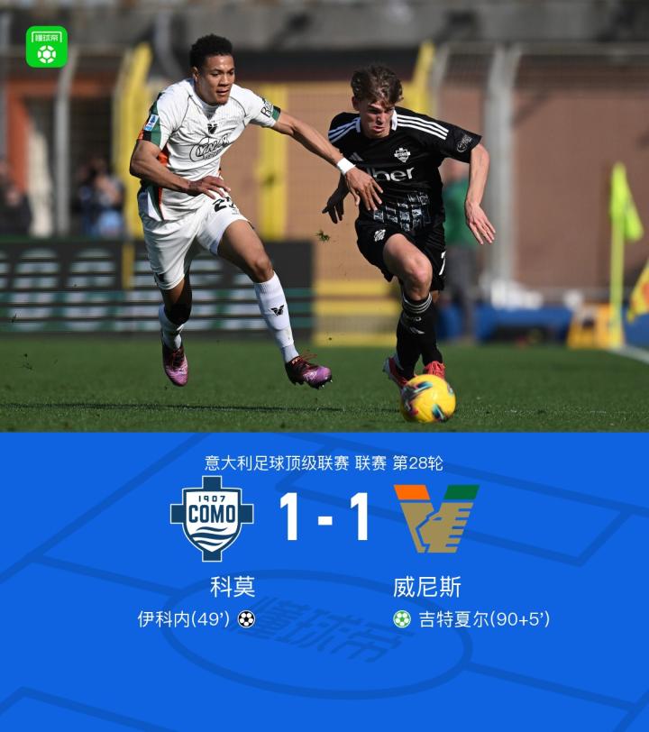北京时间3月8日,意大利足球顶级联赛第28轮,科莫主场迎战威尼斯。比赛中,科莫凭借伊科内的精彩进球取得领先,下半场补时阶段,威尼斯由吉特夏尔通过点球扳平比分。最终,双方以1-1握手言和。