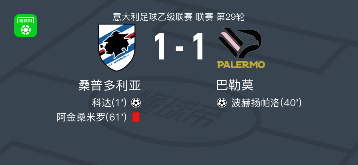 北京时间3月9日,意大利足球乙级联赛第29轮,桑普多利亚主场迎战巴勒莫。比赛开始后不久,桑普多利亚球员科达为球队首开纪录。随后,巴勒莫球员波赫扬帕洛成功扳平比分。比赛中,桑普多利亚球员阿金桑米罗因犯规被红牌罚下。最终,双方以1-1握手言和。