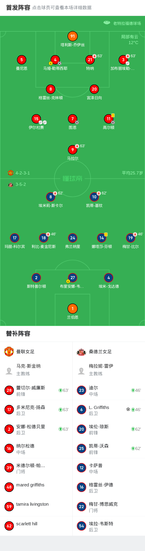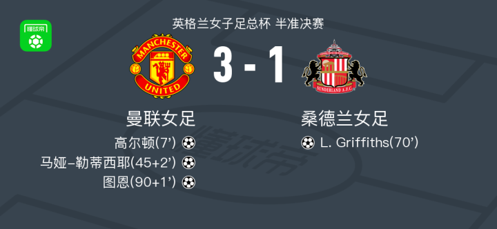 在北京时间3月9日进行的英格兰女子足总杯半准决赛中,曼联女足对阵桑德兰女足。比赛中,高尔顿率先为曼联女足打破僵局。随后,马娅-勒蒂西耶再下一城,进一步扩大了领先优势。尽管L. Griffiths为桑德兰女足扳回一球,但在比赛最后阶段,图恩再次为曼联女足攻入一球,锁定了胜局。最终,曼联女足以3-1战胜桑德兰女足,成功晋级下一轮。
