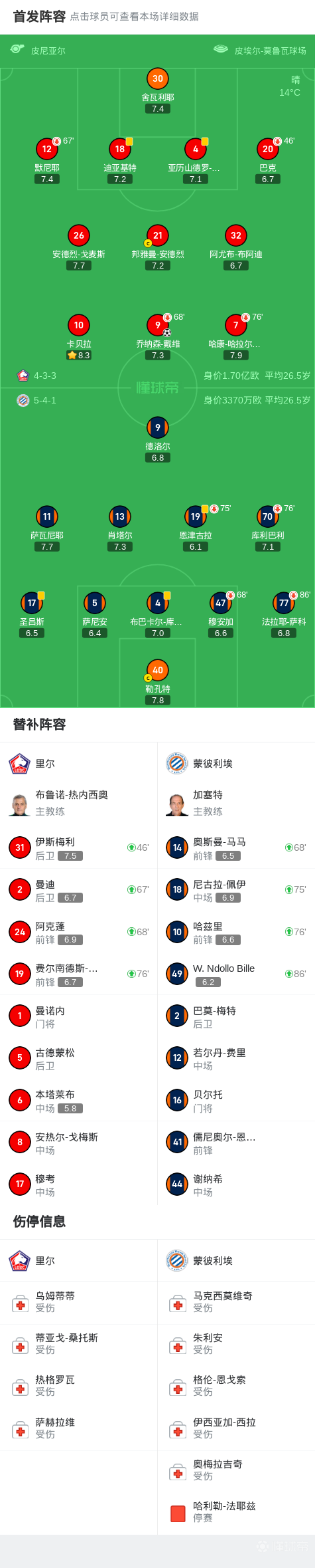 里尔1-0蒙彼利埃,乔纳森-戴维制胜