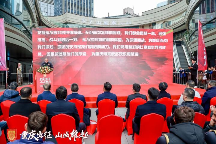 向余望、李镇全、宋攀、刘明仕从李平总经理手中接过全新比赛服,重庆市体育局党组书记、局长袁光灿将队旗授予队长向余望,完成使命交接。全场在主持人带领下齐声喊出了“重庆雄起”的口号。