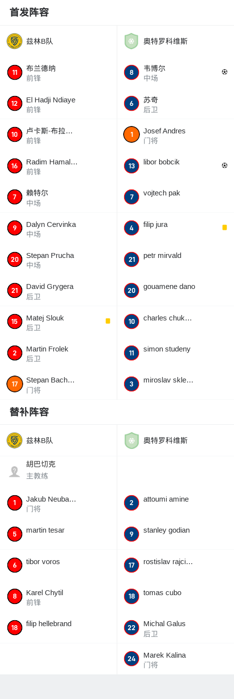 北京时间3月9日,捷克足球丙级联赛CFL MSFL组第18轮,兹林B队主场迎战奥特罗科维斯。比赛中,奥特罗科维斯展现出色进攻,libor bobcik和韦博尔相继为球队建功。最终,奥特罗科维斯以2比0战胜兹林B队,取得宝贵三分。