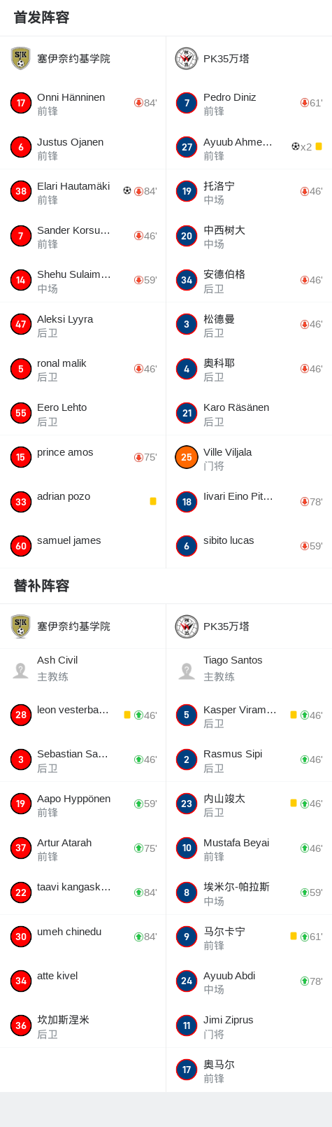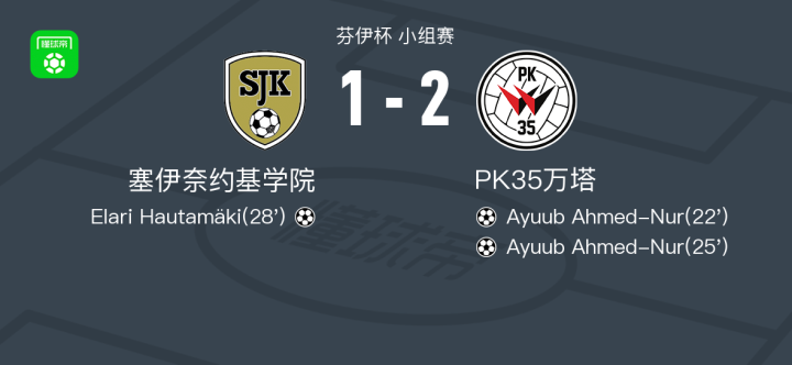 在北京时间3月9日进行的芬伊杯小组赛中,塞伊奈约基学院迎战PK35万塔。比赛中,PK35万塔的Ayuub Ahmed-Nur表现出色,成功梅开二度,为球队奠定了领先优势。随后,塞伊奈约基学院的Elari Hautamäki打入一球,为主队扳回一分。最终,PK35万塔以2-1的比分战胜塞伊奈约基学院。