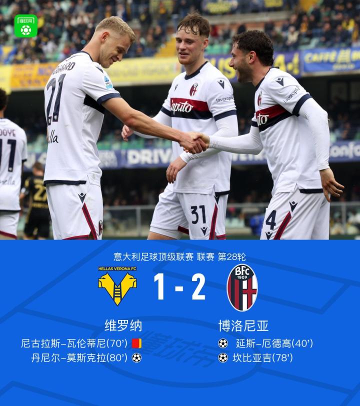 在北京时间3月9日进行的意大利足球甲级联赛第28轮比赛中,维罗纳主场迎战博洛尼亚。比赛中,博洛尼亚率先打破僵局,延斯-厄德高接到队友助攻后成功破门。随后,博洛尼亚再度扩大优势,坎比亚吉在队友的妙传下再下一城。尽管维罗纳由丹尼尔-莫斯克拉扳回一球,但未能改变最终结果。比赛过程中,维罗纳的一名球员因累积两张黄牌被罚离场。最终,维罗纳以1-2不敌博洛尼亚。